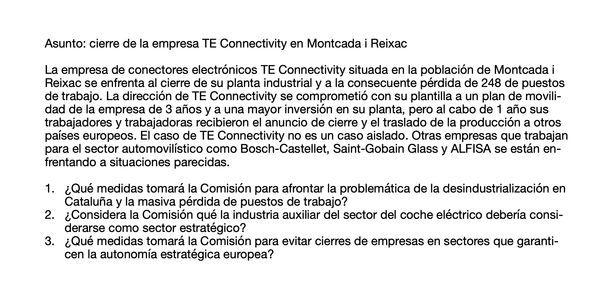Davant de casos com els de TE Connectivity preguntem a la Comissió sobre quines mesures prendran per evitar la desindustrialització que es produeix a Catalunya i per protegir a sectors estratègics.